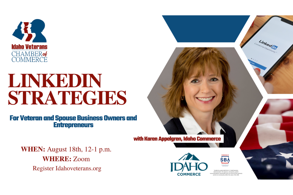 Join the Idaho Veterans Chamber of Commerce, and our very own Business Retention and Expansion Manager, Karen Appelgren, on August 18 for a webinar on LinkedIn Strategies.